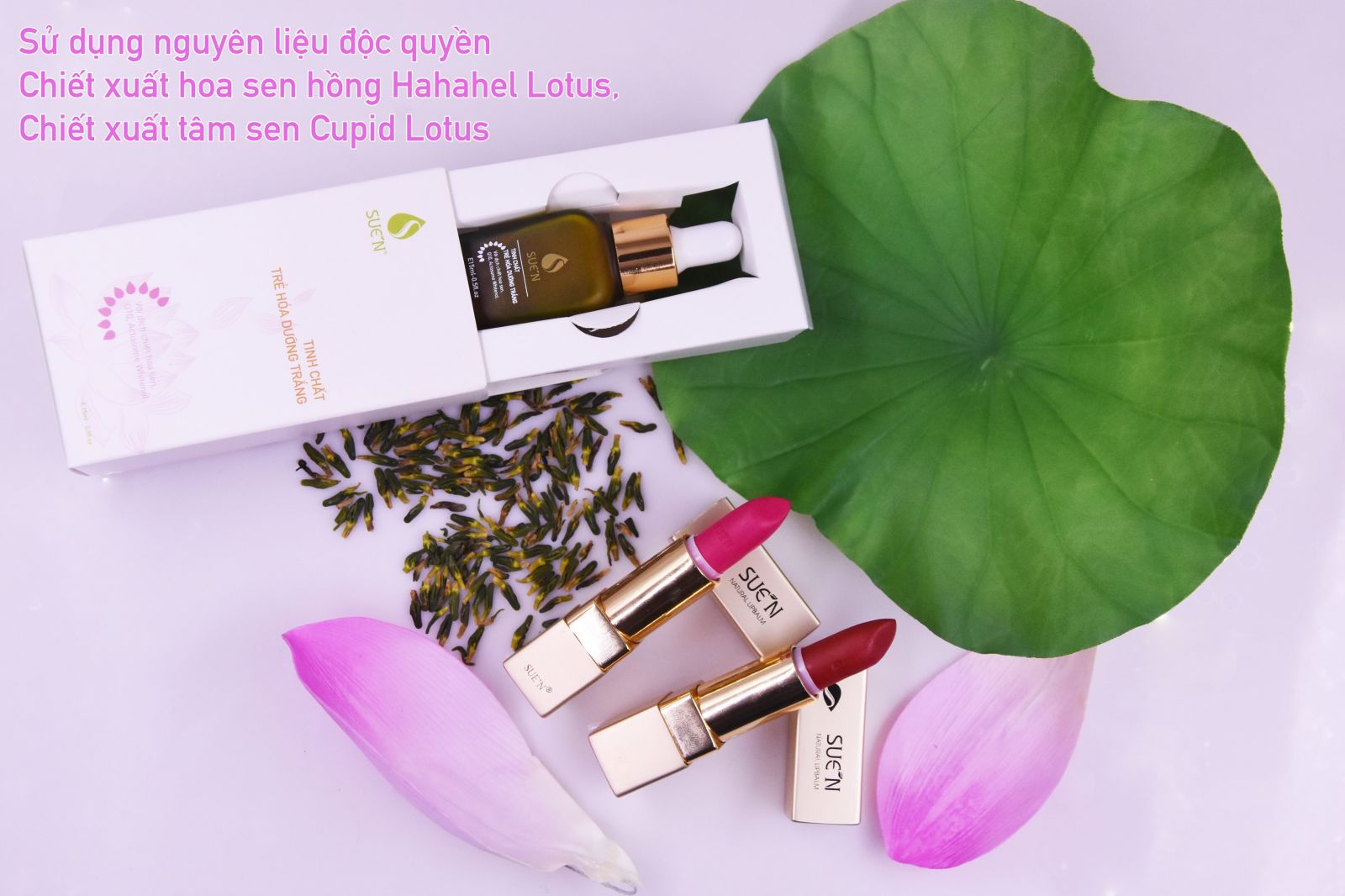 Trong định hướng chuỗi mỹ phẩm sinh thái về sen, chúng tôi tự chủ động các nguyên liệu cơ bản sau: Chiết xuất hoa sen hồng Hahahel Lotus, Chiết xuất tâm sen Cupid Lotus, Chiết xuất trầu không rừng toàn phần. Đây là những nguyên liệu độc quyền chỉ Sue’N mới có, đặc biệt là Chiết xuất hoa sen hồng Hahahel Lotus, Chiết xuất tâm sen Cupid Lotus. Chúng tôi chỉ sản xuất ra nguyên liệu và không thực hiện buôn bán nguyên liệu này. Các quý khách hàng và đối tác chỉ có thể sử dụng sản phẩm chứa hai dòng chiết xuất này tại Sue’N.